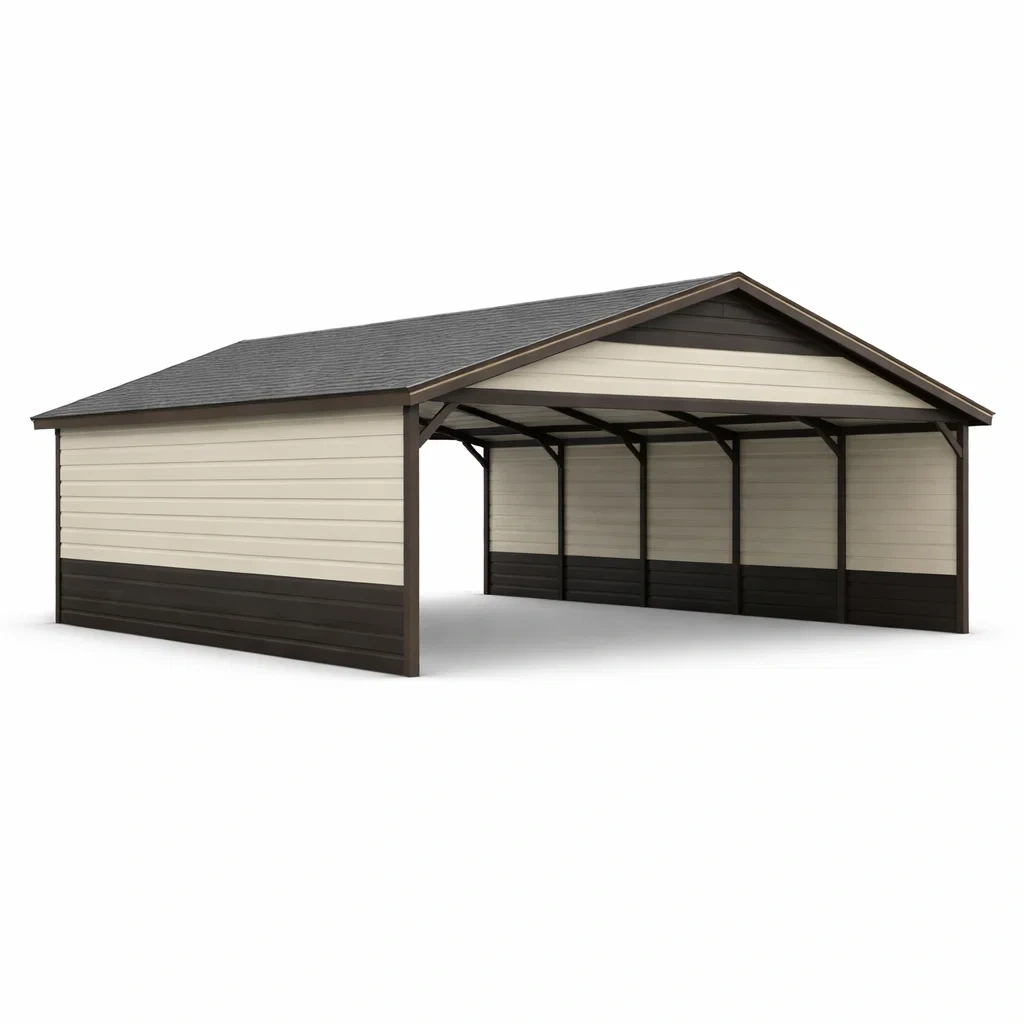 Abri pour voiture en métal avec structure en acier et panneaux composites beige et noir