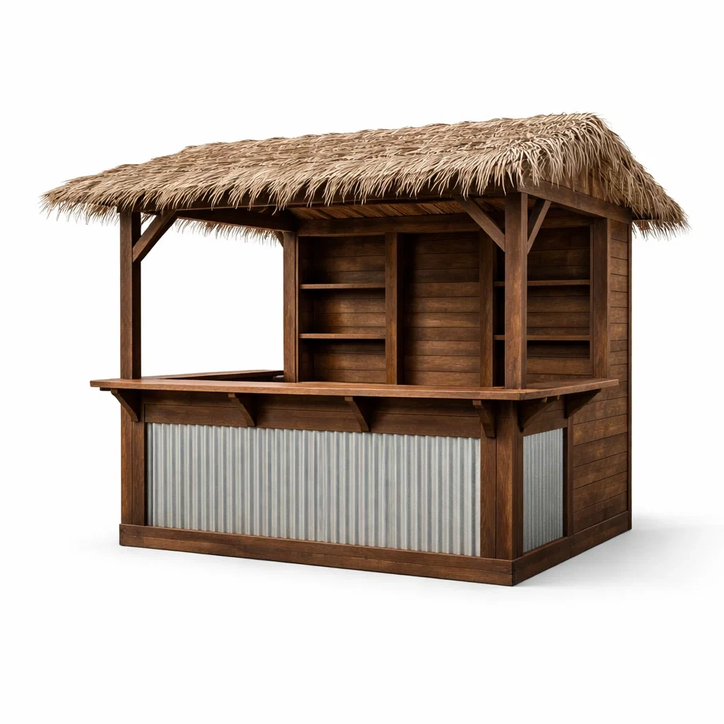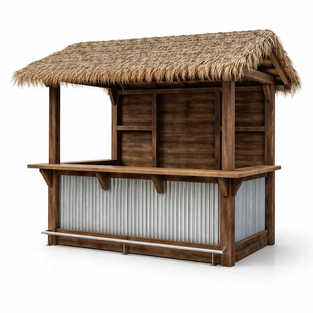 Kiosque bar de jardin en bois avec toit en chaume et façade métallique