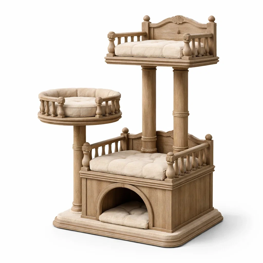 Arbre à chat multi-niveaux fabriqué en bois massif avec plateformes rembourrées avec des coussins en lin. Dispose d'une hauteur totale de 120 cm. Conçu pour le repos et l'escalade des chats, avec une cachette intérieure pour plus de confort. Les coussins sont amovibles. Dimensions : Hauteur 120 cm, Largeur 60 cm, Profondeur 40 cm. Convient uniquement pour une utilisation en intérieur.