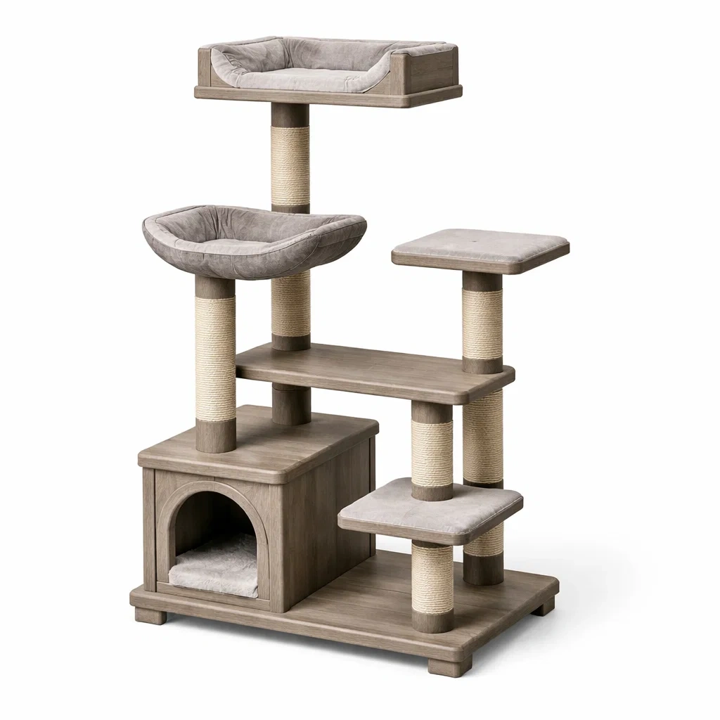 Composants : Plateforme supérieure avec coussin, niche inférieure, poteaux recouverts de sisal, plateformes de repos.