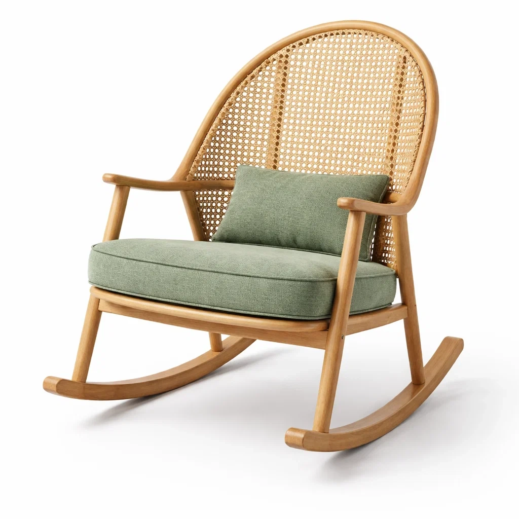 Fauteuil à bascule en bois et rotin avec coussin vert